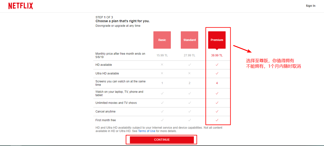 选择你的奈飞计划,我建议是最贵的,当然了最贵的1个月换算成rmb大约50左右,不到50: