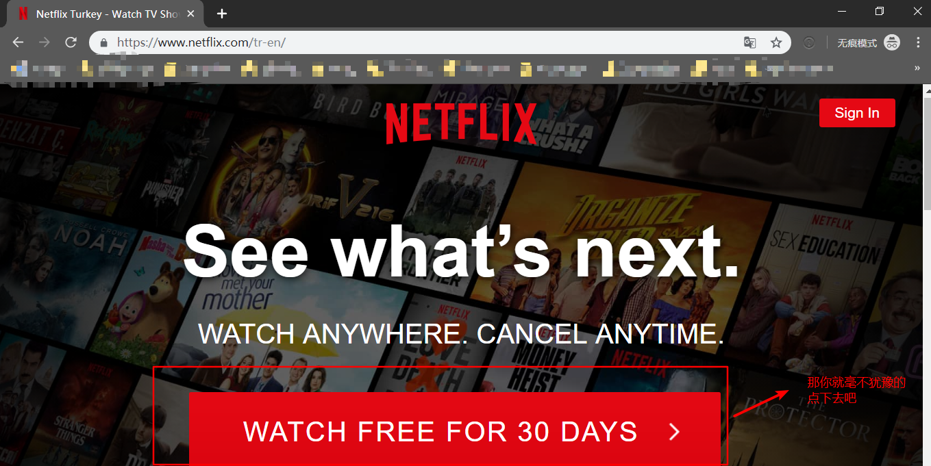 代理设置好了以后,打开奈飞官网, 当然了之前让你准备土耳其的飞机场到这里就见到效果了,他会把你定位到奈飞的土耳其区,地址是 https://www.netflix.com/tr-en/