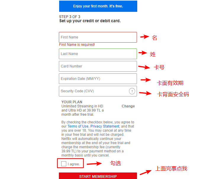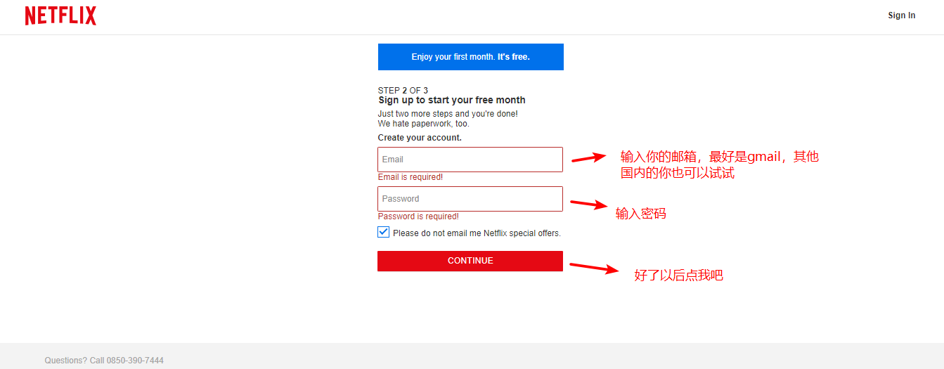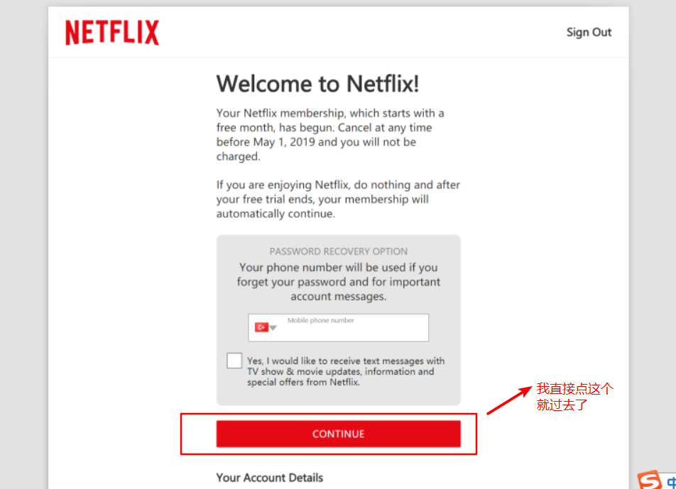 然后下一步就有点诡异了,为啥说诡异呢?因为由于奈飞国内注册的人太多,导致奈飞必须要输入土耳其当地的手机号,接收短信来进行验证,我还以为我到这一步就GG了呢,没想到我人品大爆发,可以跳过这一步,,我单方面猜测一下可能与你用的代理提供商有关系,有的ip可是被奈飞重点关照的。