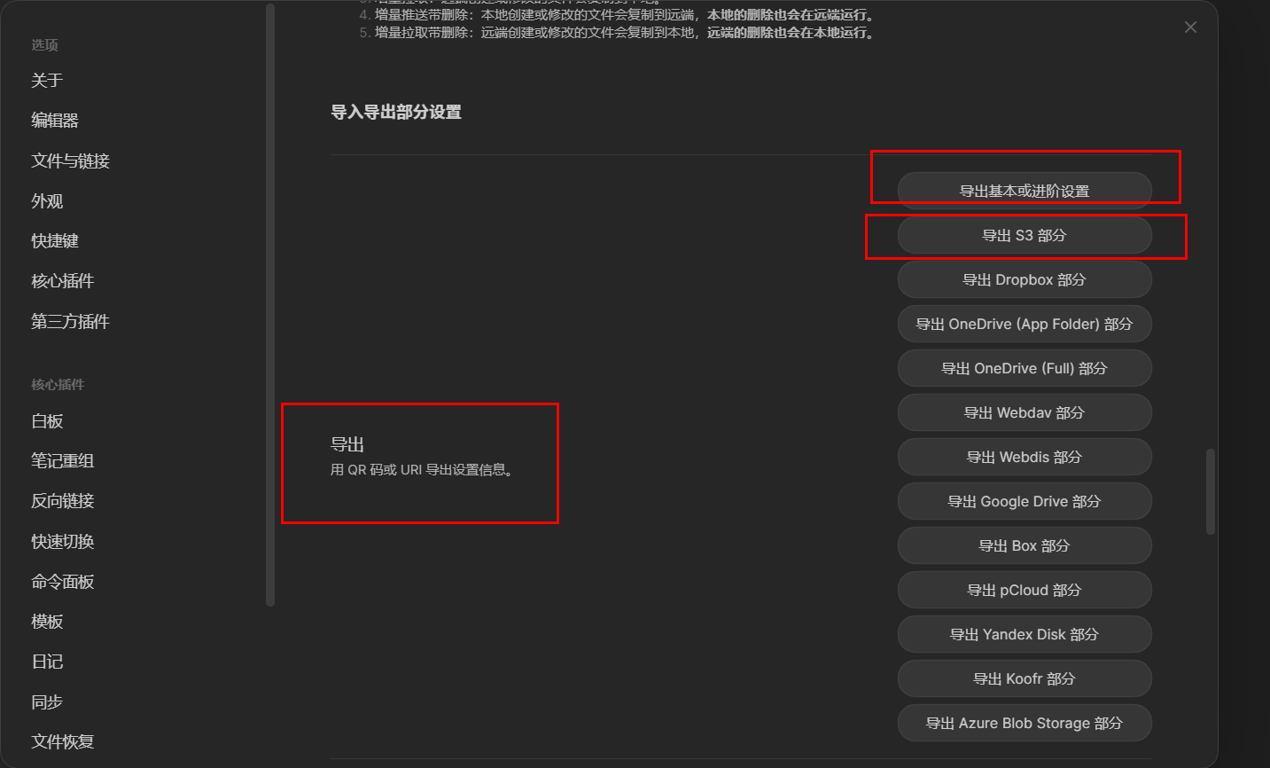 导出基本设置和s3设置给手机端使用,当然了你也可以扫码,我这里是复制到手机上打开的,手机上到应用商店安装obsidian客户端和remotely插件,这个要先做哦